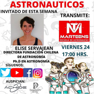 La directora de FUCHAS, Elise Servajean, estará este viernes 24 de julio a las 17:00 hrs, conversando en vivo con la Escuela de Astronautas en el programa Astronáuticos. No te lo pierdas en Instagram @escueladeastronautas !