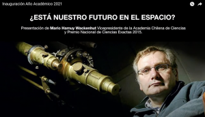 Un recorrido por la historia del universo para responder la pregunta ¿Está Nuestro Futuro en el Espacio? Clase magistral del Presidente de la Fundación Chilena de Astronomía (FUCHAS), Mario Hamuy, durante la Inauguración Año Académico 2021 del Instituto de Chile, que agrupa a las academias del país (Academia Chilena de la Lengua, Academia Chilena de la Historia, Academia Chilena de Ciencias, Academia Chilena de Ciencias Sociales, Políticas y Morales, Academia Chilena de Medicina y Academia Chilena de Bellas Artes). Puedes verla aquí.