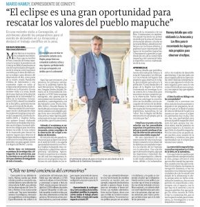 En la oportunidad, fue entrevistado por el diario El Sur, donde destacó la labor astronómica que se realiza en la zona, además del trabajo de los colaboradores de Fuchas Nicola Astudillo-Defru y Daphne Iturra. Igualmente, hizo un avance respecto a lo que será el próximo eclipse de diciembre de 2020.